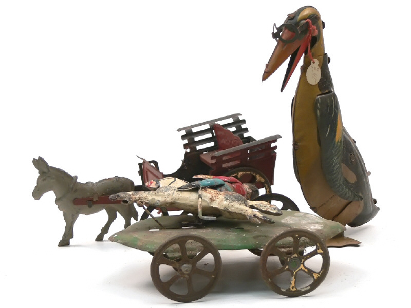 états de 'D' à 'E' - comprend : un jouet à tirer représentant un enfant sur un cheval, une carriole tractée par un âne (une fixation de roue déficiente) & un pingouin mécanique (moteur à clef fonctionne) - importantes traces d'oxydation principalement sur 2 modèles - quelques parties cassées
