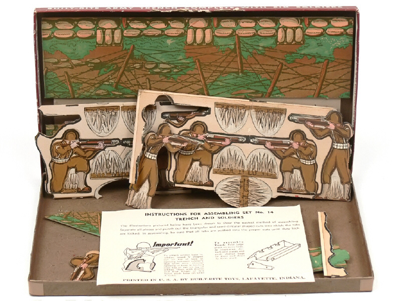 fabrication en carton des années 1930 - comprend différentes pièces permettant de monter une tranchée & 8 soldats de 2 types différents - éléments jamais assemblés d'origine - avec notice