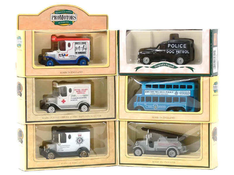 séries limitées avec certificats - comprend : 2 ambulances, 2 fourgons de police, un trolleybus & un camion échelle de pompiers - on y retrouve les marques : PROMOTORS, PROMOTIONAL MODELS & CORGI