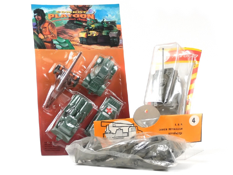 sous plastique jamais ouvert - on y joint un blister 'COMBAT PLATOON' (jamais ouvert & de marque indéterminée) contenant une JEEP, une ambulance, un canon & un blindé ainsi qu'un sachet de la marque NOREDA référence 4 jamais ouvert de 3 véhicules militaires à monter (contenant : un EBR, 2 MERCEDES dépannage & canons antiaériens)