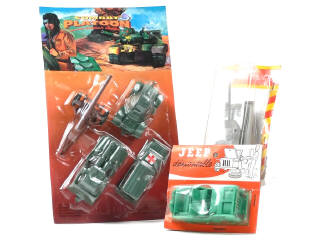sous plastique jamais ouvert - on y joint un blister 'COMBAT PLATOON' (jamais ouvert & de marque indéterminée) contenant une JEEP, une ambulance, un canon & un blindé ainsi qu'une JEEP démontable sous blister de marque indéterminée