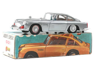 longueur 22,5 cm - moteur à friction (fonctionne) - avec mécanismes de mitrailleuses avant, de siège éjectable & de pare-balles arrière (2 à revoir) - siège passager désolidarisé de sa base - quelques petites fêlures sur le toit