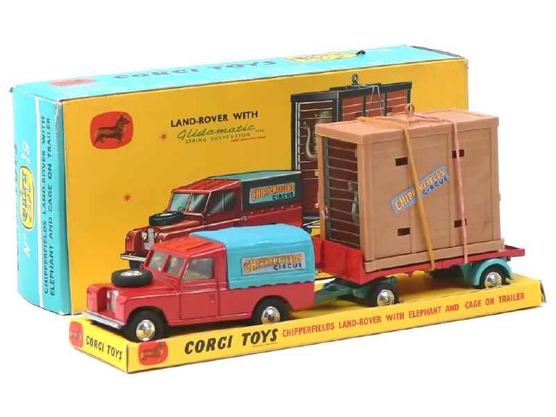 CORGI TOYS (GB) GS19 LAND ROVER Pick-up bâché 'CHIPPERFIELD' avec remorque cage à éléphant rouge & bleu