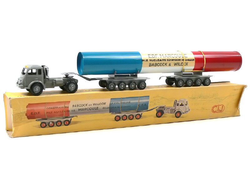 version avec décalque 'BOURGEY-MONTREUIL' sur le fronton de la cabine du tracteur & pile avec décalques 'BABCOCK & WILCOX MARCOULE' - quelques jantes de remorque très légèrement fondues - petites traces d'humidité sur la base du support de roue de secours