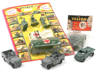 contient : un autocar militaire ambulance, JEEP ambulance & 3 soldats - sous blister jamais ouvert - on y joint un sachet contenant 4 camions militaires différents de la marque 'TALLON', 2 JEEP & un camion (incomplet) de marque indéterminée