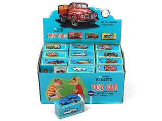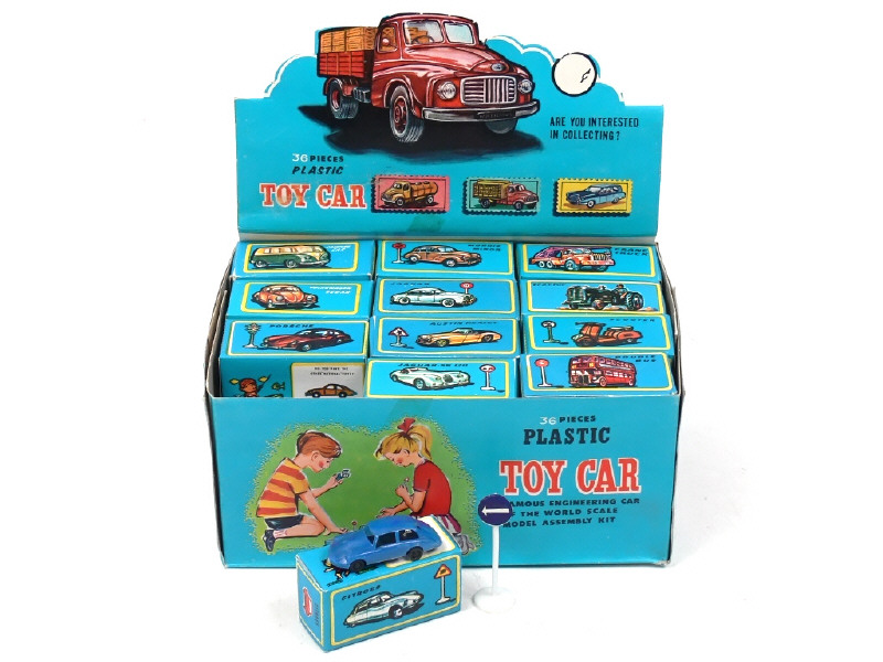 petites échelles - réalisation en plastique - contient notamment CITROEN DS 19, PORSCHE 356, VOLKSWAGEN COCCINELLE, AUSTIN HEALEY, tracteur agricole, dépanneuse, scooter ... - chaque modèle est en boîte individuelle dont certains avec un panneau de signalisation - la surboîte est en état 'b'