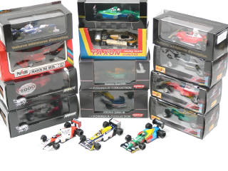 miniatures reproduisant notamment les modèles : FOOTWORK ARROWS, LAROUSSE FORD, HAVOLINE LOLA, Mc LAREN HONDA, FORD, WILLIAMS RENAULT, TYRRELL HONDA, FERRARI, JORDAN FORD, BENETTON FORD, LOLA FORD, JORDAN YAMAHA & MARCH - on y retrouve notamment les marques : ONYX, TAMIYA, MAISTO, KYOSHO, POLISTIL & YAXON