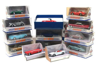 miniatures reproduisant les modèles : TRIUMPH, AUSTIN HEALEY, FERRARI, CADILLAC, MG, STUDEBAKER, DELAHAYE, BENTLEY, FORD & BUICK