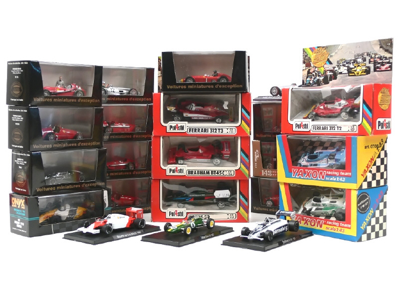miniatures reproduisant les modèles : FERRARI, MERCEDES, BRABHAM, COOPER, ALFA ROMEO, WILLIAMS, LOTUS, LIGIER, Mc LAREN & MINARDI - on y retrouve notamment les marques : BRUMM, YAXON, POLISTIL & ONYX