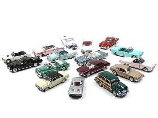 échelle 1/43ème - miniatures reproduisant notamment les modèles : EDSEL, FORD, CADILLAC, STUDEBAKER, LINCOLN, CHEVROLET, PACKARD, BUICK & RAMBLER - quelques véhicules avec un petit marquage sur le plancher