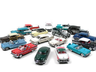 échelle 1/43ème - miniatures reproduisant notamment les modèles : FORD, CHEVROLET, PACKARD, OLDSMOBILE, NASH, CHRYSLER, HUDSON, PLYMOUTH & DE SOTO - quelques véhicules avec un petit marquage sur le plancher