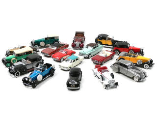échelle 1/43ème - miniatures reproduisant notamment les modèles : PIERCE ARROW, DODGE, MERCURY, BUGATTI, MERCEDES, ROLLS ROYCE, DUESENBERG, FORD & CHEVROLET - quelques véhicules avec un petit marquage sur le plancher