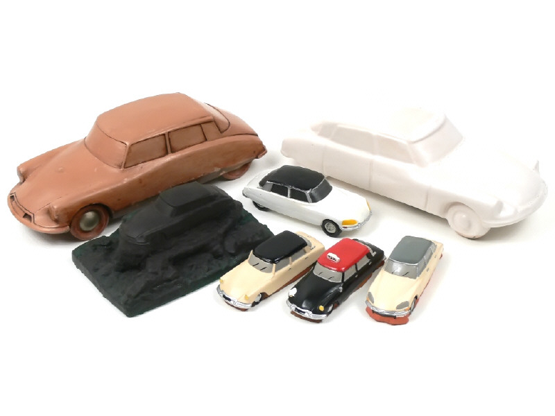 longueur de 11 à 16,5 cm - 3 modèles réalisés en plâtre de la marque A. LERAY dont 2 copies de la marque NOREV (un exemplaire en état 'C' avec un petit manque sur le phare avant droit, sur le socle & sur le panonceau de toit) - un autre réalisé en céramique & un autre en caoutchouc