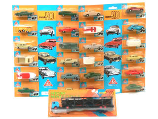 échelle 1/86ème - miniatures reproduisant les modèles : CITROEN, OPEL, BMW, CHEVROLET, DODGE, STUDEBAKER, FORD, MERCEDES & ROVER - comprend également un bateau sur remorque & une caravane - chaque emballage se détache permettant la vente des véhicules à l'unité - blister jamais ouvert