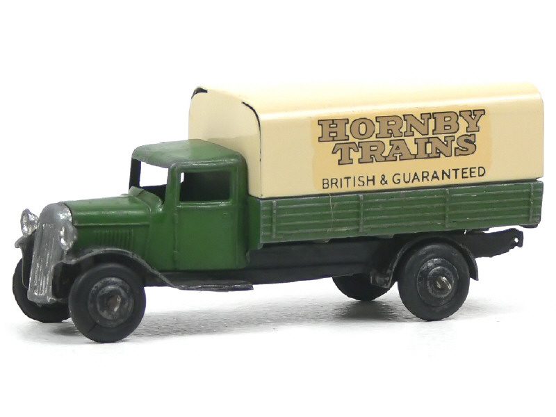 DINKY TOYS (GB) 25B Camion bâché 'HORNBY TRAINS' vert olive, châssis noir & bâche crème