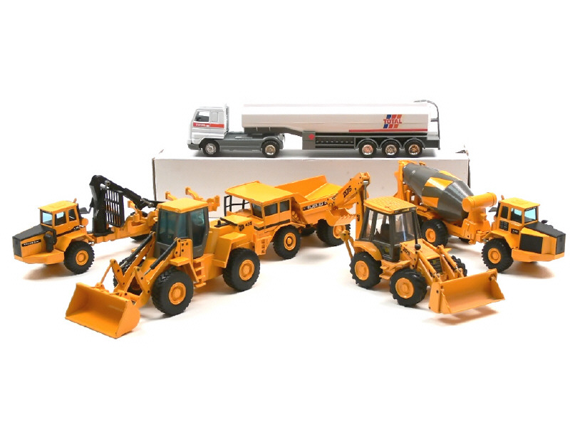 états de 'B' à 'D' - miniatures reproduisant les modèles : JCB, EUCLID & VOLVO - avec manques - on y joint un camion-citerne de marque indéterminée (état 'A.b')