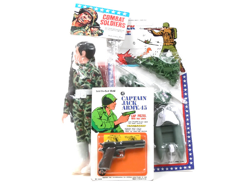comprend : un soldat (26 cm), un revolver COLT 45 & un set ATTACK FORCE (une barge de débarquement, un hélicoptère, un zodiac & un lot de soldats)