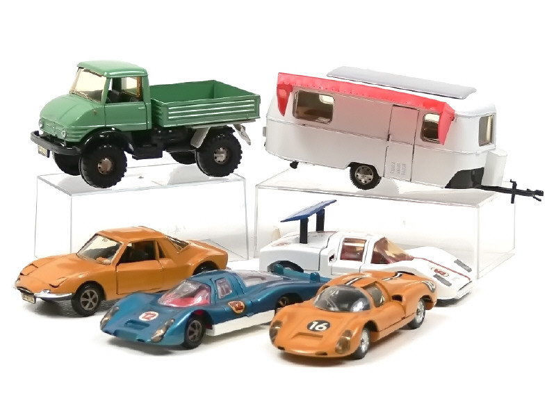 comprend : MERCEDES UNIMOG, CHAPARRAL 2F (jantes légèrement fondues), MATRA M 530 (très légères traces d'oxydation sur les jantes), PORSCHE 910 (jantes légèrement fondues) & 907 - la caravane est en état 'C'