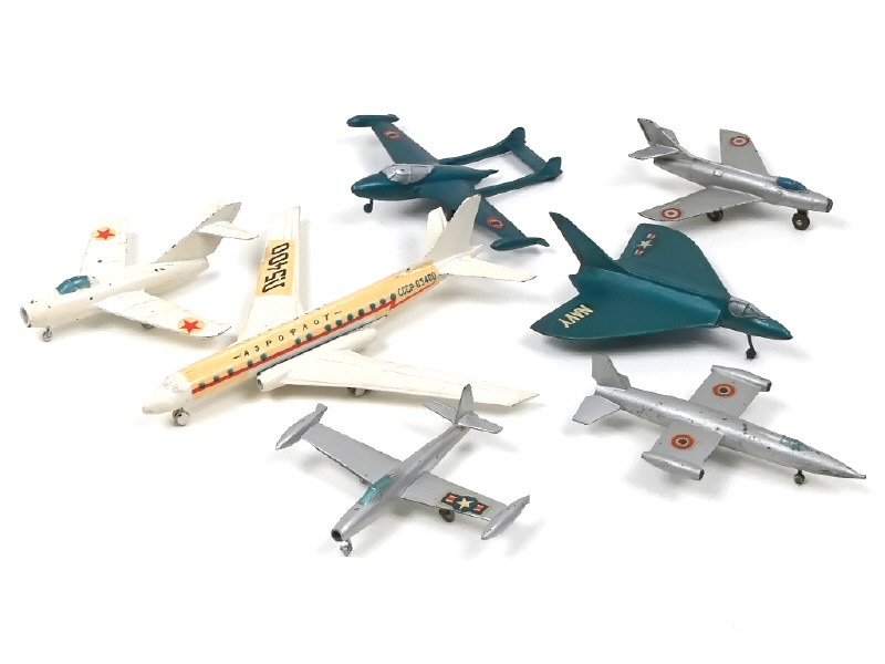 états de 'C' à 'D' - miniatures reproduisant les modèles : AQUILLON, MIG 15, SKYRAY, MYSTERE IV A (de la marque DINKY TOYS FRANCE), THUNDERJET, TRIDENT & TUPOLEV TU 104 - quelques petits manques
