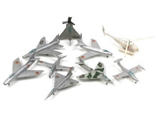 états de 'C' à 'D' - miniatures reproduisant les modèles : FAIREY DELTA, MORANE-SAULNIER, HAWKER HUNTER, FOUGA MAGISTER, MYSTERE IV, SUPER MYSTERE B2, SUPER SABRE, CONVERT XFY1 & SIKORSKY S55 - quelques extrémités légèrement déformées