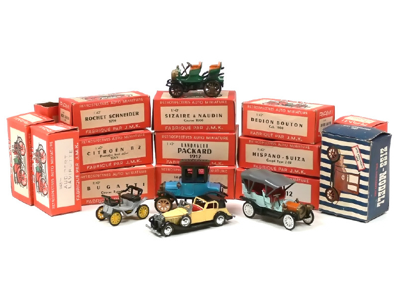 miniatures reproduisant les modèles : ROCHET SCHNEIDER, CITROEN (état 'B'), BUGATTI (défauts de rivetage du plancher), DELAUNAY BELLEVILLE, HISPANO SUIZA (2 exemplaires), DEDION BOUTON (2 exemplaires différents), LANDAULET PACKARD (un enfoncement sur la calandre), PEUGEOT (état 'B'), SPA, AUDIBERT LAVIROTTE, OPEL (de la marque ZISS MODELL), SIZAIRE & NAUDIN (état 'B') - quelques traces d'oxydation & carrosseries encrassées - 4 boîtes en état 'c'