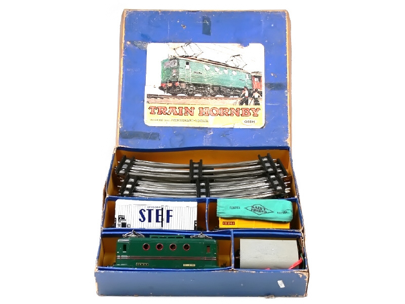 contient : une motrice électrique BB-8051, un wagon 'SAINT-FRERES', un wagon frigorifique 'STEF', un transformateur, 12 rails courbes, 5 broches d'assemblage & une fiche d'instructions - quelques traces d'oxydation & déformations - couvercle de boîte non d'origine