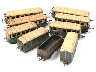 JEP (FRANCE) Ensemble de 6 voitures de voyageurs, 2 wagons-fourgons & un wagon-tombereau avec vigie