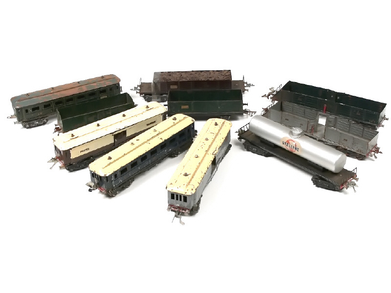 L.R. 'O' (FRANCE) Ensemble de 2 voitures de voyageurs, un wagon-citerne, 2 wagons-fourgons & 5 wagons-tombereaux