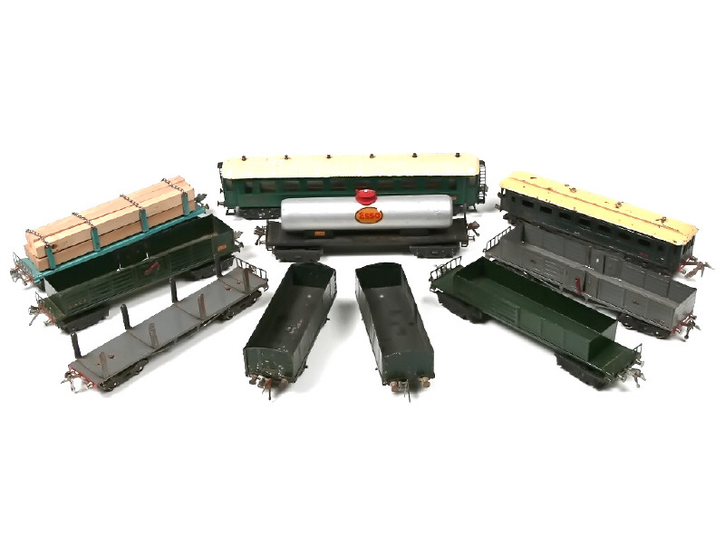 L.R. 'O' (FRANCE) Ensemble de 2 voitures de voyageurs, un wagon-citerne, 2 wagons-plateaux à ranchers & 5 wagons-tombereaux