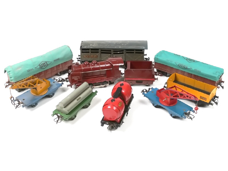 HORNBY 'O' (FRANCE) Ensemble d'une locomotive à vapeur 'type 120' avec tender, un wagon-tombereau, 2 wagons-grue, un wagon-fourgon, un wagon-foudre double, un wagon porte-tubes & 2 wagons bâchés