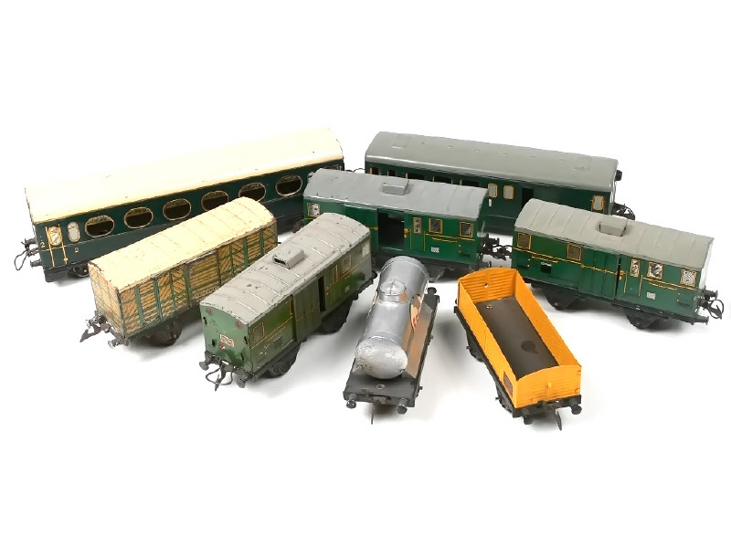 HORNBY 'O' (FRANCE) Ensemble d'une voiture de voyageurs, une voiture mixte voyageurs & bagages, 4 wagons-fourgons, un wagon-citerne, un wagon-bétaillère & 2 wagons-tombereaux