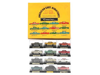échelle HO dont 5 en état 'C' - contient : PLYMOUTH, CADILLAC, BUICK, DODGE, DESOTO, RAMBLER, PONTIAC, CHEVROLET, OLDSMOBILE, CHRYSLER, IMPERIAL & WOLKSWAGEN (non conforme au coffret) - fabrication des années 1950 - véhicules en boîtes-vitrines individuelles avec étiquettes de désignation sur chacune d'elles (une manquante) - BEL ENSEMBLE !
