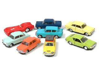 comprend : SIMCA 1000, FORD (ANGLIA & CORTINA), MERCEDES de course, BMW 700 LS, CITROEN AMI 8 (manque rivet), D.K.W JUNIOR & RENAULT 17 TS - carrosseries légèrement déformées - 4 modèles avec jantes fondues
