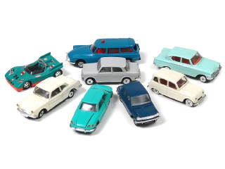 comprend : SIMCA 1100, PEUGEOT 404 coupé, CITROEN ID 19 ambulance, RENAULT 4 L, FORD CONSUL 315, FIAT 1100 D, PANHARD 24 BT & LIGIER JS 3 - carrosseries légèrement déformées - 5 véhicules avec jantes fondues