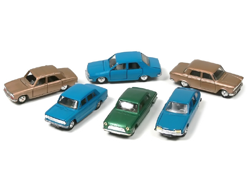 série métal - comprend : FIAT 124, 1500, CITROEN GS, FORD TAUNUS 12M, RENAULT 12 (état 'C') & PEUGEOT 304 (manque vitrage avec traces d'humidité sur la carrosserie) - quelques plaques minéralogiques retouchées