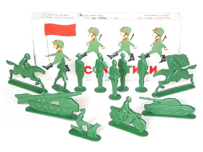 réalisation en métal (en trompe l'oeil) - comprend un char, un camion lance-fusée, une moto, 2 cavaliers à cheval & 7 soldats - BEL ENSEMBLE