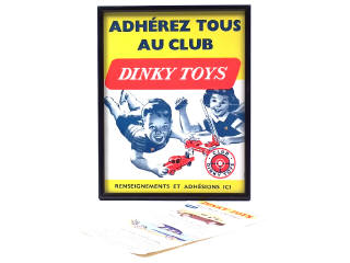 dimension 26,5 x 21 cm - ce support publicitaire (encadré) était adressé aux revendeurs MECCANO afin de promouvoir la création du tout nouveau 'CLUB DINKY' - cette affichette était accompagnée d'une lettre explicative & de formulaires d'adhésion - SUPERBE ILLUSTRATION ! - on y joint un feuillet (pour le marché hollandais) représentant principalement 2 nouveautés (SINGER GAZELLE & PLYMOUTH PLAZA)