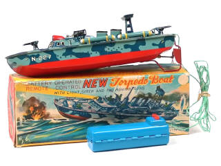 LINE MAR TOYS (JAPON) J-1933 NEW TORPEDO BOAT en tôle lithographiée gris, rouge & bleu
