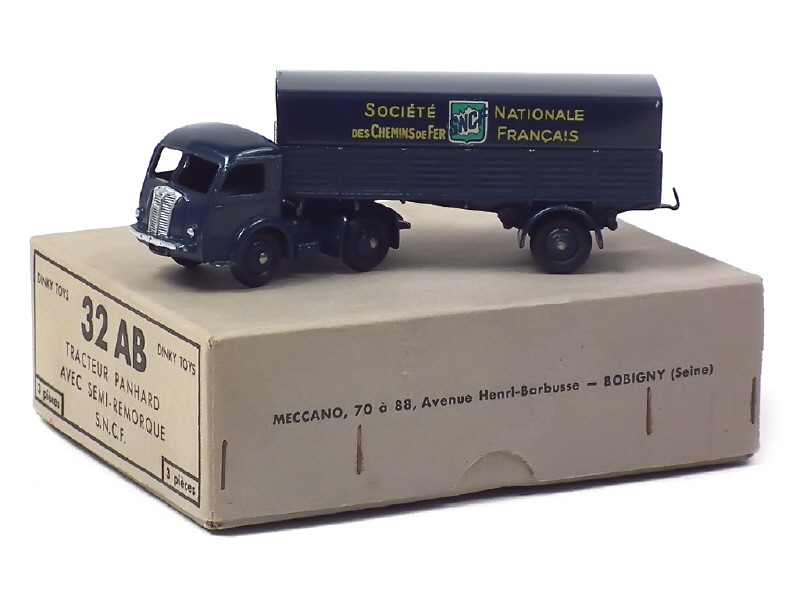 DINKY TOYS (FRANCE) 32AB PANHARD Semi-remorque 'S.N.C.F' (version avec intérieur de toit quadrillé) bleu foncé (fond de l'écusson uni)