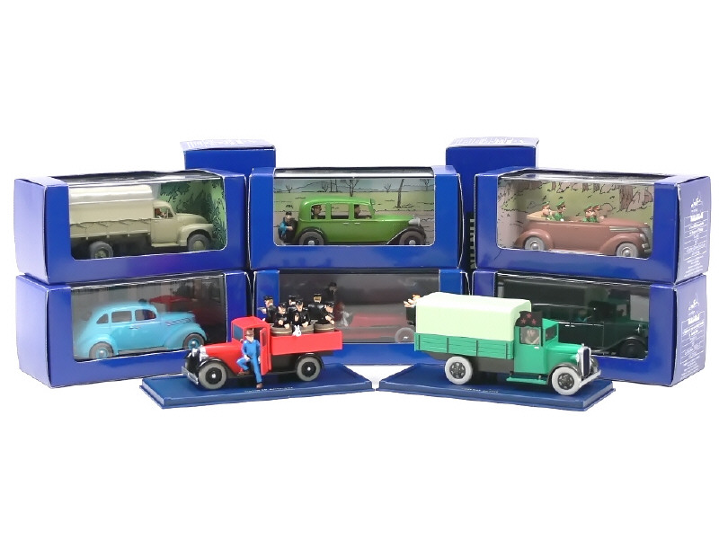 collection 'EN VOITURE TINTIN' - comprend les références : 002, 009, 025, 034 (boîte 'c'), 038, 041, 062 & 063 - sous boîtes-vitrines