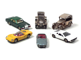 états de 'A' à 'D' - miniatures reproduisant les modèles : DATSUN (traces d'humidité), CHEVROLET, TOYOTA (manque toit amovible), LOTUS, ROLLS ROYCE & NISSAN (verrière de capot moteur décollée avec traces de colle & fixation déficiente - on y retrouve notamment les marques : YONEZAWA TOYS, ASAHI TOY & TAISEIYA