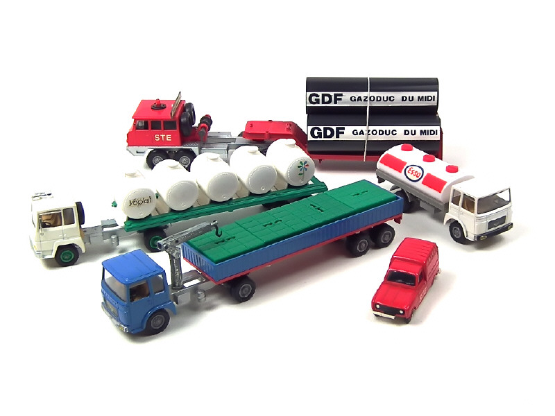 comprend : SAVIEM SM 300 semi-remorque plateau à ridelles avec bras de chargement télescopique (bras terni, jantes très légèrement fondues), BERLIET TR 300 semi-remorque plateau porte-cuves à lait ' YOPLAIT' (jantes légèrement fondues, fixation de remorque non d'origine, traces d'oxydation sur la lamelle de maintien de béquilles, manque quelques décalques), BERLIET T 12 semi-remorque surbaissée transport de tubes 'GDF' (quelques manques) avec RENAULT 4 fourgonnette (pare-chocs avant incomplet) & SAVIEM SM 300 citerne 'ESSO' (jantes fondues)