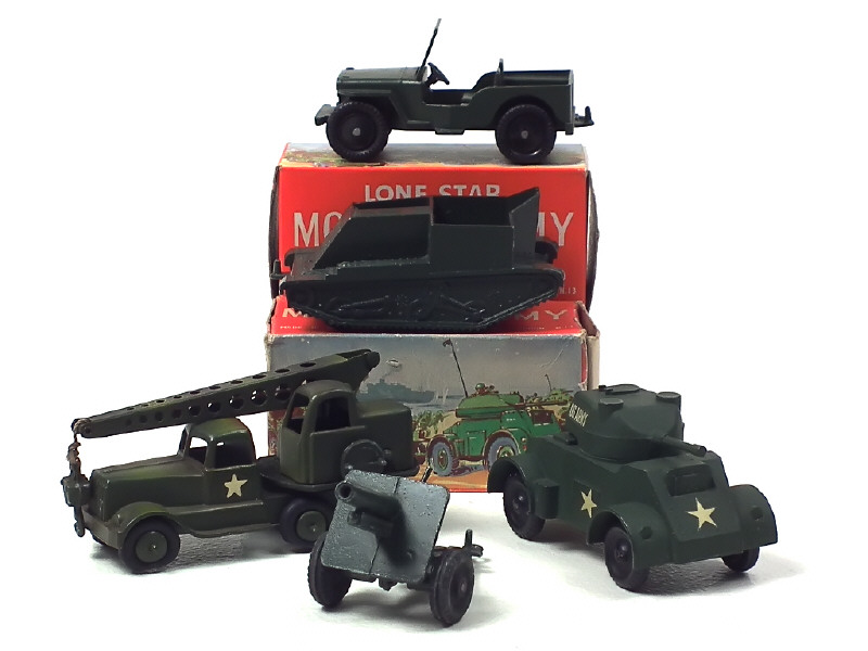 états de 'B' à 'C' - comprend : BREN GUN CARRIER (en boîte état 'c', manque personnages), JEEP (en boîte état 'c') & ARMOURED CAR - on y joint un camion-grue de l'armée américaine de la marque CRESCENT TOY avec pneus affaissés - le canon est en état 'D'