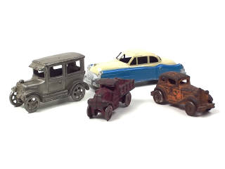 longueur 15,5 cm - petites traces d'oxydation sur les jantes - on y joint 3 véhicules en fonte de marque indéterminée en états de 'E' à 'R'