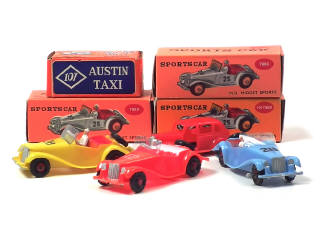 copies en plastique avec une boîtes parfaitement imitées du modèle de DINKY TOYS GB - on y joint une AUSTIN TAXI de marque indéterminée - annotations sur 2 boîtes
