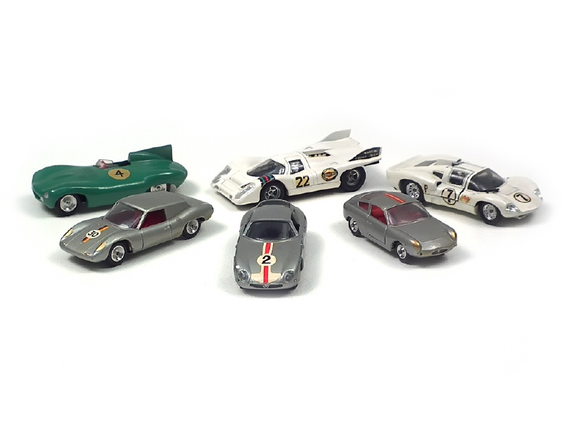 miniatures reproduisant les modèles : ABARTH 1000, PORSCHE GT LE MANS (traces de colle sur le côté gauche de la carrosserie), JAGUAR LE MANS (manque pilote), ALFA ROMEO GIULIA TZ (jantes ternies), CHAPARRAL 2 D & PORSCHE 917