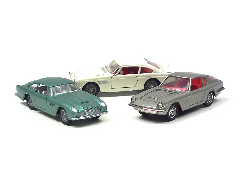 miniatures reproduisant les modèles : MASERATI 3,5L, ASTON MARTIN DB5 VANTAGE & FERRARI 250 GT 2+2 (version avec compteur de vitesse rapporté, volant à 3 branches & phares moulés, jantes à rayon ternies, COULEUR PEU COURANTE)