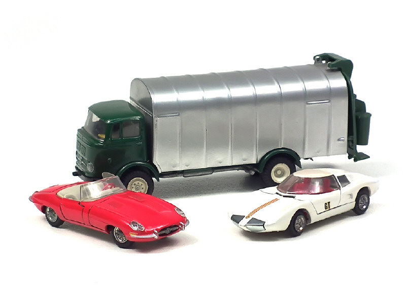 miniatures reproduisant les modèles : MERCEDES benne à ordures, JAGUAR type 'E' (un petit défaut sur le train avant) & MONZA GT (carrosserie légèrement encrassée) - petits manques