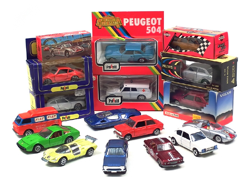 états de 'A' à 'C' - miniatures reproduisant les modèles : ALFA ROMEO (2 exemplaires), FIAT (3 exemplaires), FORD, FERRARI (4 exemplaires), PEUGEOT, PORSCHE (2 exemplaires), LANCIA, ROLLS ROYCE & VOLVO - on y retrouve les marques : POLISTIL, POLITOYS, MERCURY & MEBETOYS - 8 véhicules avec boîte - quelques décalques ajoutés - petits manques