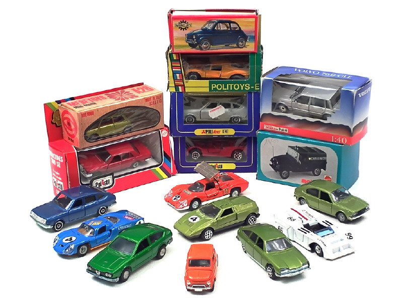 miniatures reproduisant les modèles : ALFA ROMEO (2 exemplaires dont un en état 'C'), CHAPARRAL, CITROEN, FERRARI (2 exemplaires), FIAT, JEEP, LANCIA (2 exemplaires), MERCEDES (2 exemplaires), MINI, PANTHER, MATRA & VOLVO - on y retrouve les marques : POLISTIL, POLITOYS, MERCURY & MEBETOYS - 8 modèles avec boîte en état 'c' - quelques petits manques
